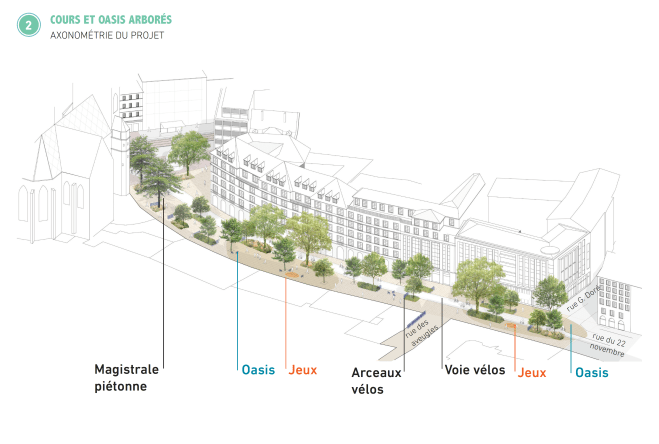 La voie vélo est dessinée parallèlement aux façades de la rue du 22 Novembre, afin de s’harmoniser avec le patrimoine de la grande percée. Sur la place, la voie est implantée de façon à libérer de l’espace au débouché de la rue du jeu des enfants, pour renforcer le caractère de place ; au droit de l’église, l’espace est agrandi afin de créer un véritable parvis.