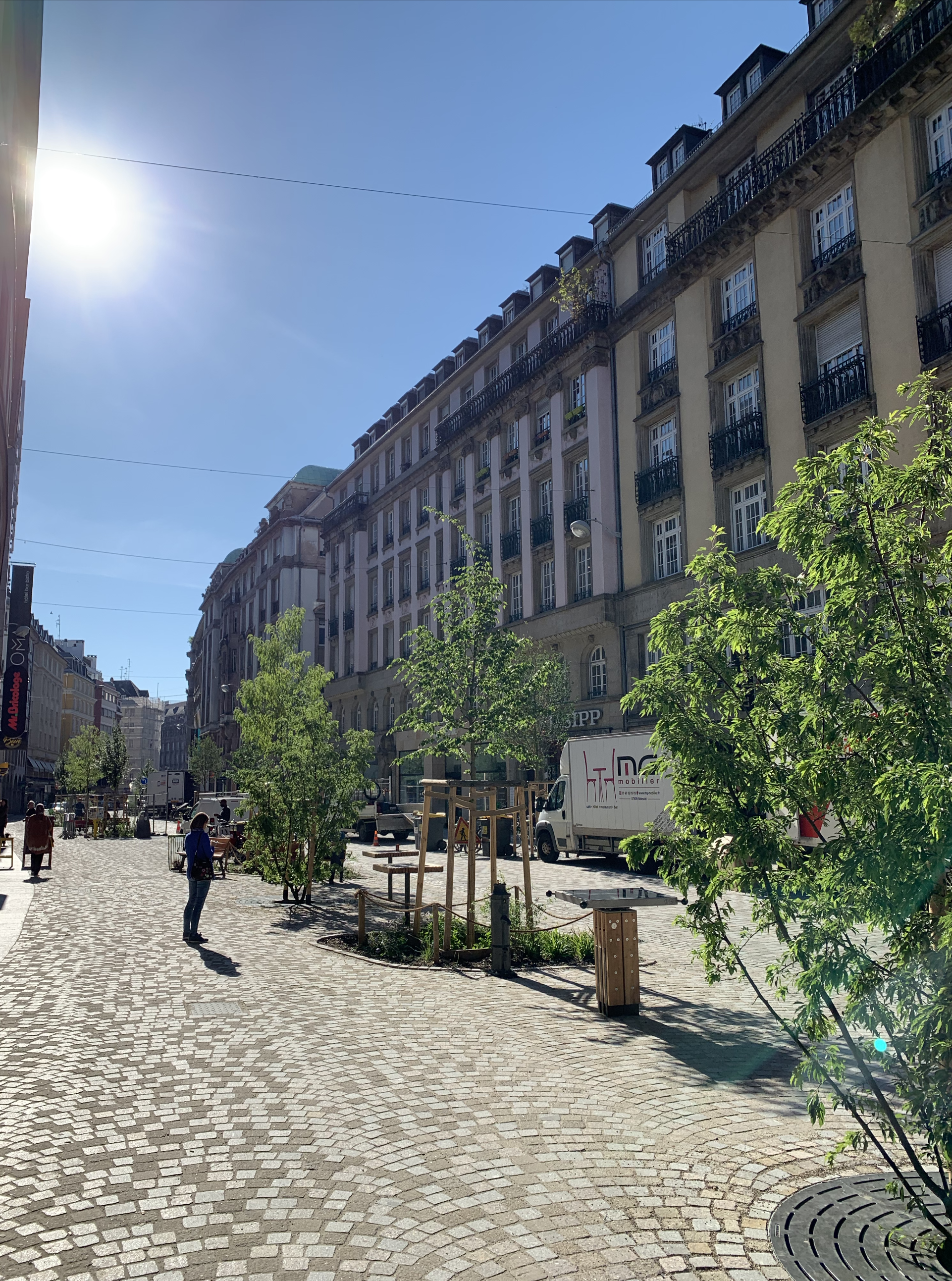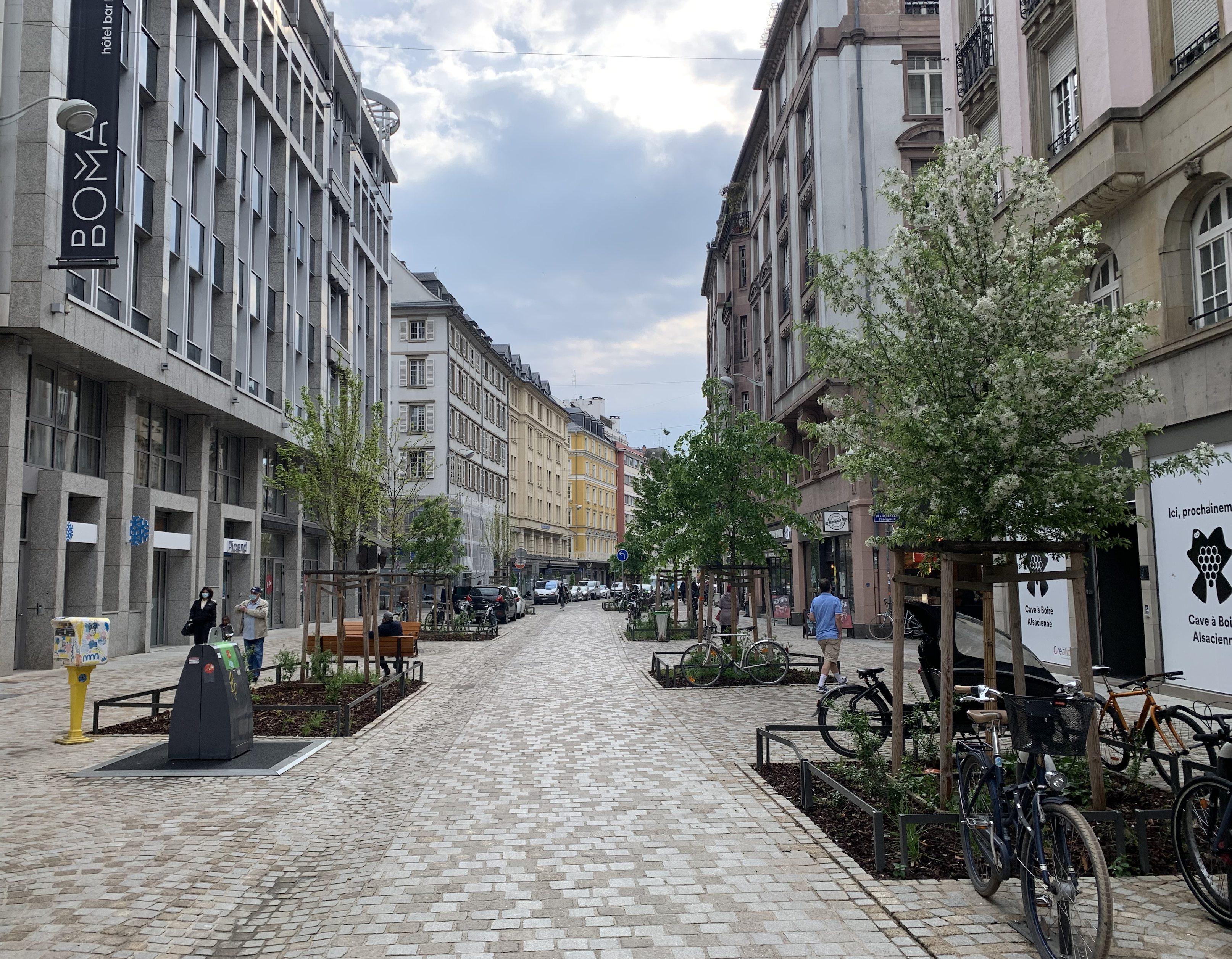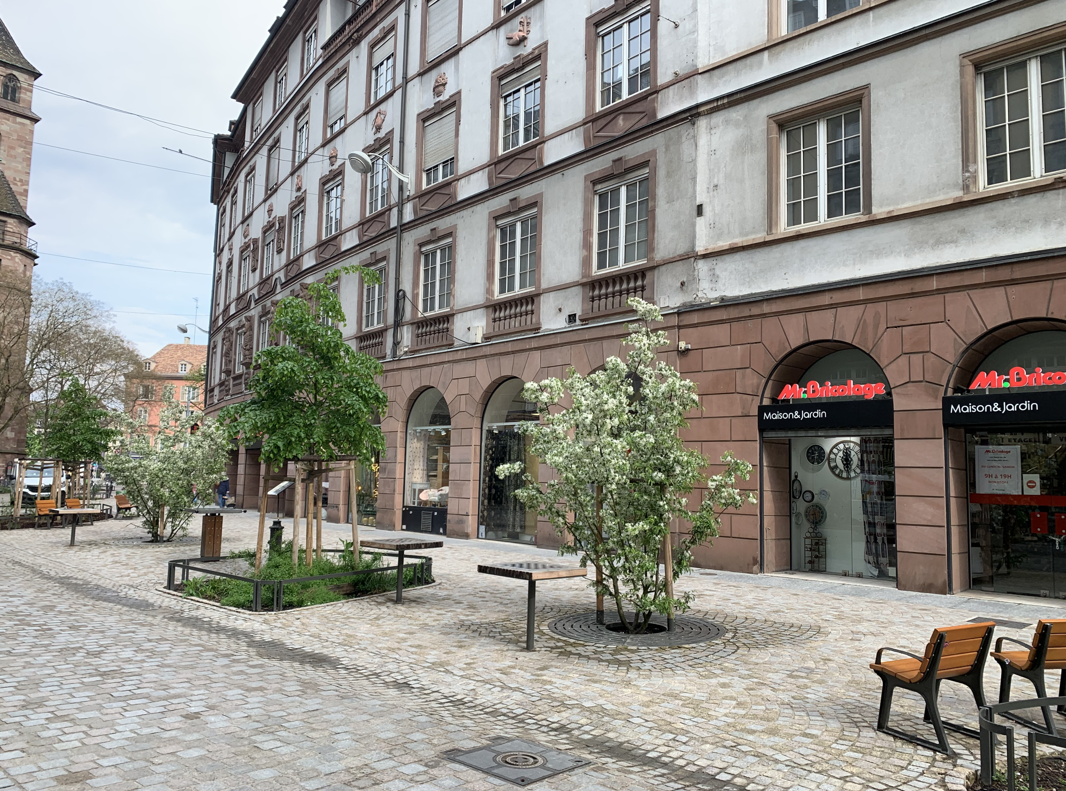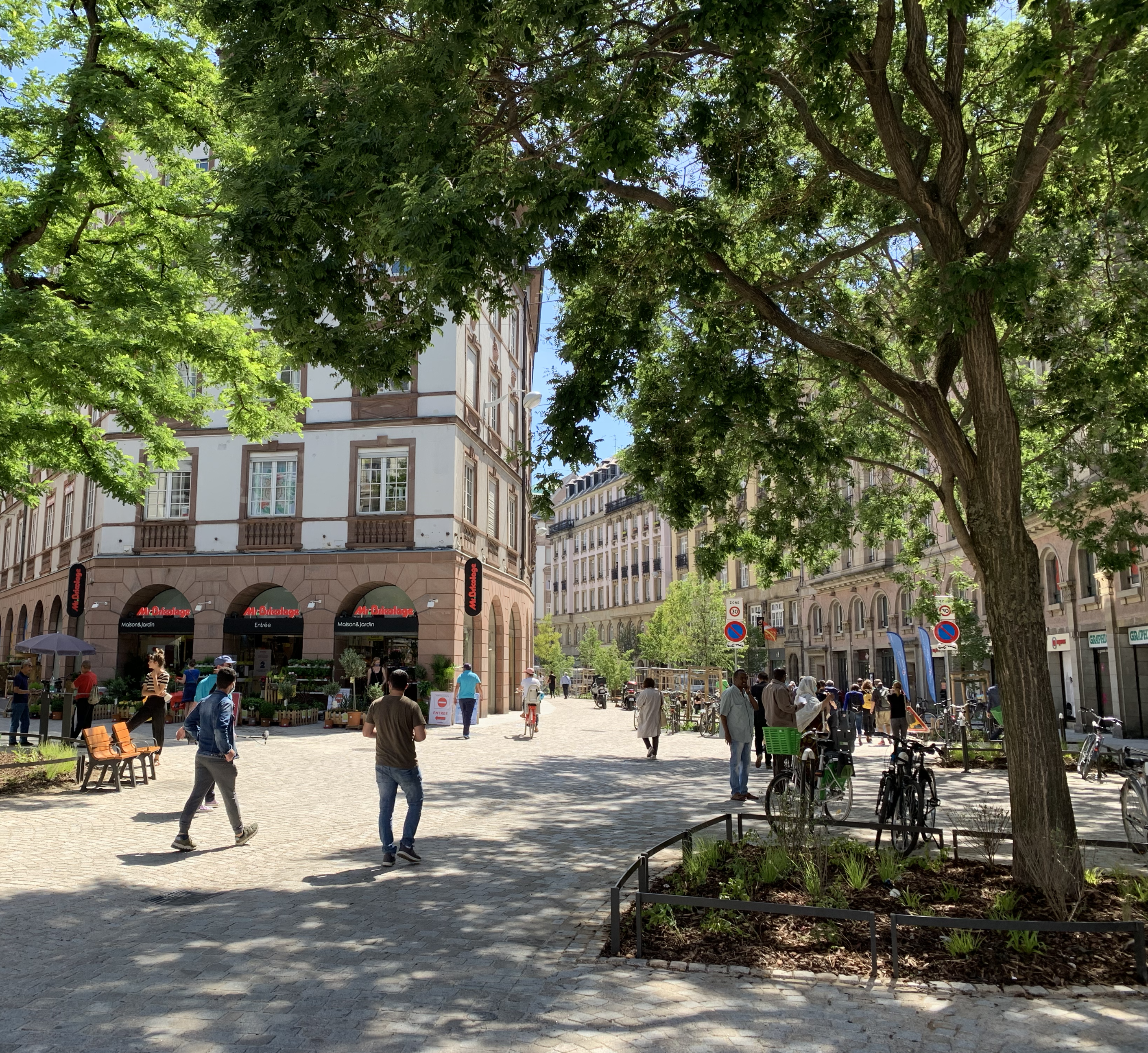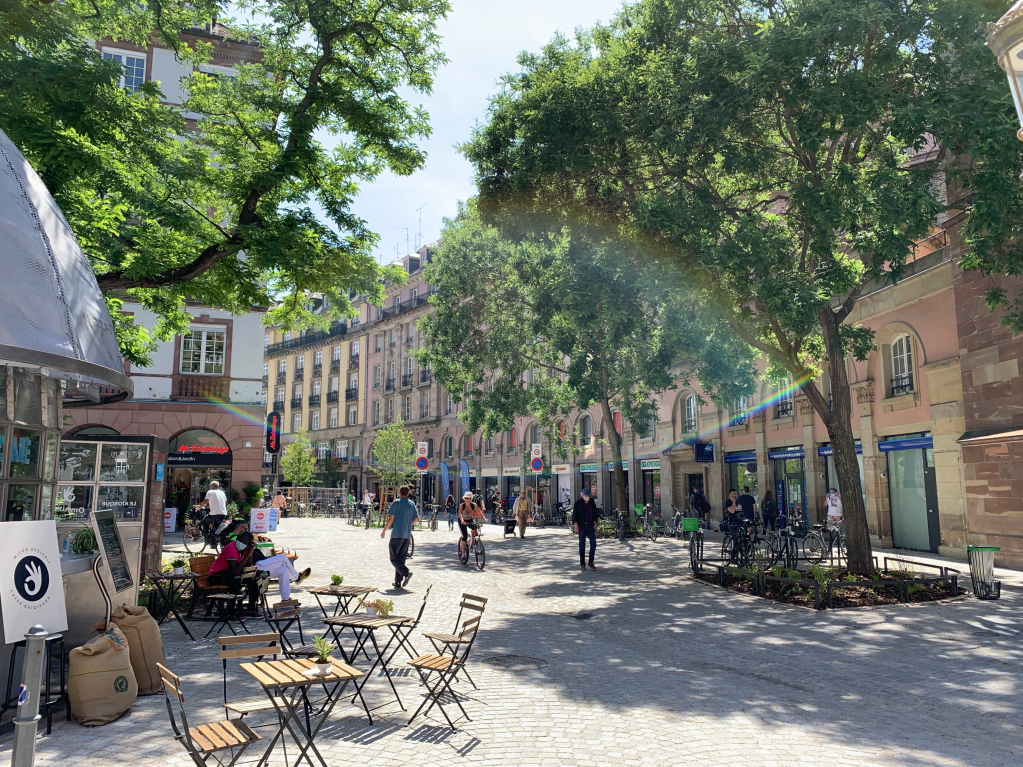 Le projet se compose autour de deux oasis. Ce sont des lieux arborés, fleuris, ludiques avec des tables de jeu, tels de petits jardins pour les Strasbourgeois. D’un genre hybride entre place linéaire et rue piétonne, le projet déploie une strate arborée de 19 arbres, afin d’ombrager les surfaces minérales, d’apporter de la légèreté et de scénographier les vues sur l’église St-pierre ainsi que sur les immeubles. Chaque espace pouvant être planté l’est. L’espace existant très contraint par les réseaux et les fonctions nécessaires à la vie d’une ville a été le support d’un plan arboré aux hauteurs et volumes de houppiers variables. Demain, ces différents arbres formeront un corridor reliant le réservoir de biodiversité de la place Kléber et les quais renaturés de l’Ill.