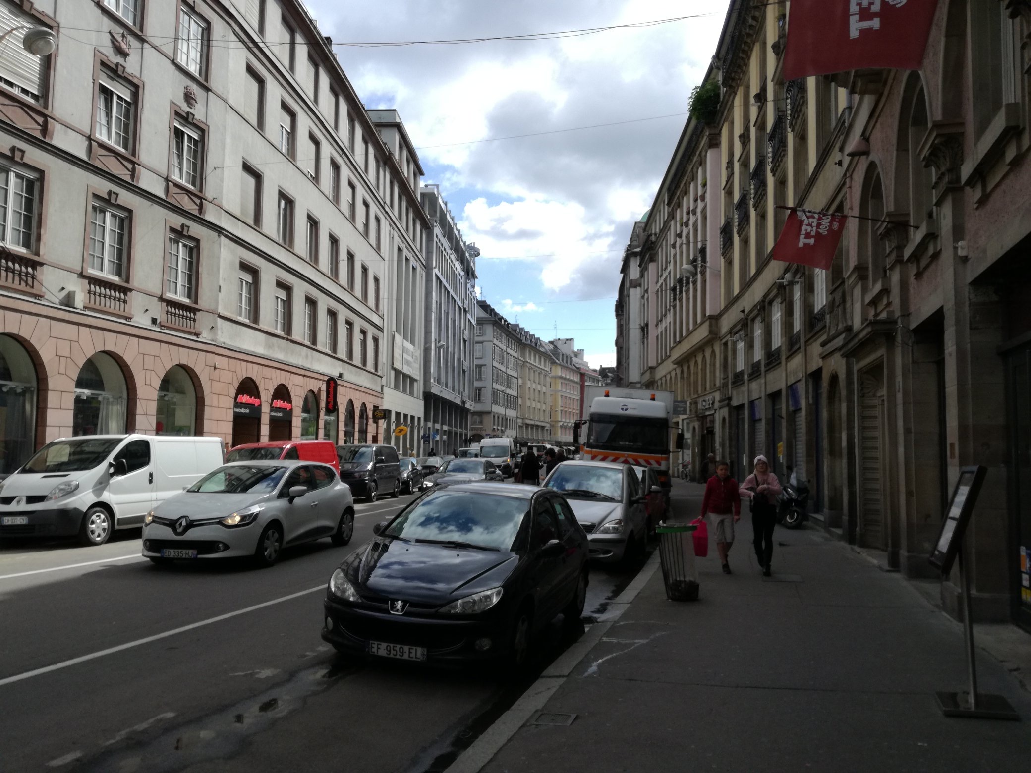 Le sol est en pierre naturelle. C’est un mélange de pavés granit, de 5 teintes douces et chaleureuses posées en arcs de cercles. Ce sol apporte de la luminosité à la rue, s’inscrit dans les teintes des immeubles historiques en étant plus doux, et confère une dimension joyeuse, habitante à la rue, loin d’une rue trop austère. Des dalles en granit type gneiss issues du stock de l’Eurométropole sont réutilisées sur l’ensemble du linéaire des pieds de façade ainsi que sur le parvis de l’église. Ce matériau amène une cohérence avec la Place Kléber.