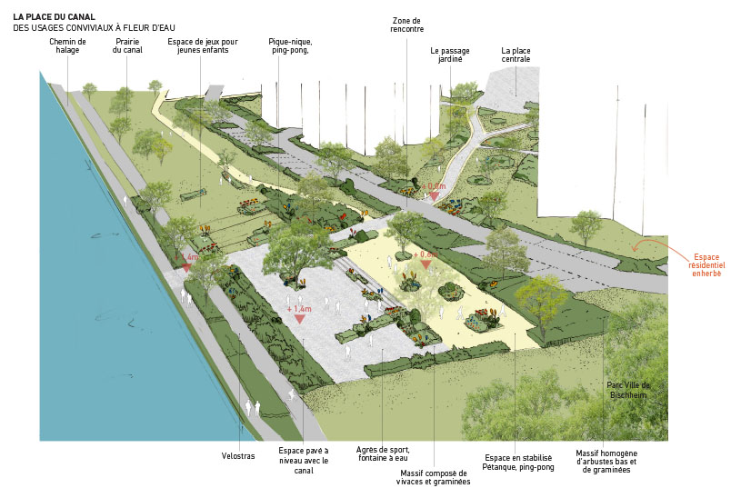 Les paysages perceptibles depuis l’allée majeure progressent de l’intérieur vers l’extérieur du quartier. L’allée mène à la place du canal et à un grand parc champêtre dédié aux vergers et aux potagers, le long du chemin de hallage du canal. Cette seconde place sur le canal permet enfin de profiter du plus beau paysage : celui où ont été implantés les immeubles dans les années 60. La topographie sera remaniée en douceur à cet endroit pour que la place soit à niveau avec le canal. Les habitants y auront accès facilement. Les deux places sont reliées par un passage fleuri et arboré équilibrant le rapport avec les immeubles.