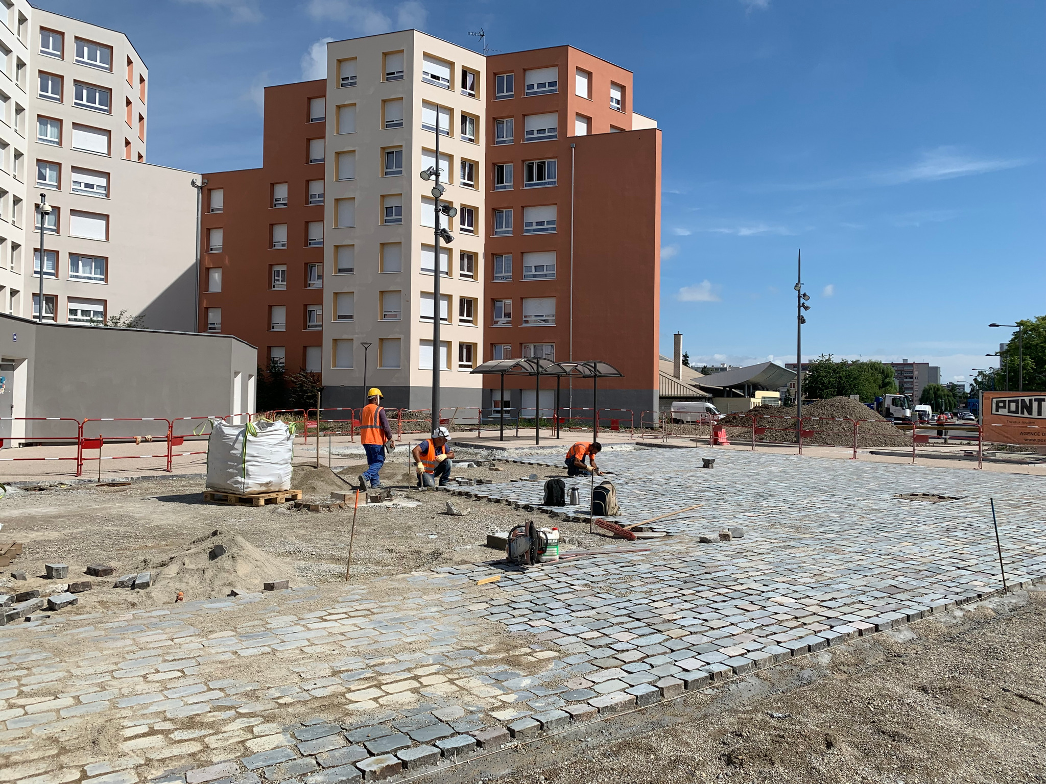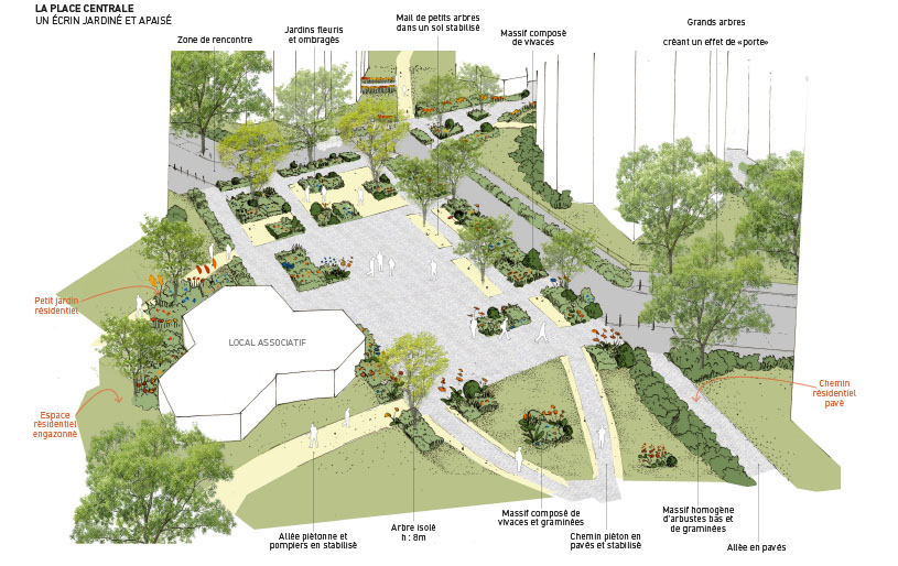 La nouvelle structure paysagère s’articule autour de l’allée majeure. Depuis la place centrale arborée, une vue sur l’église du centre-ville est préservée. Cette vue lointaine et historique permet de se sentir plus proche du centre-ville depuis le coeur du quartier. La place centrale arborée est un espace polyvalent accueillant des usages urbains (foodtruck, pétanque…). Cette «place de village» permet l’arrêt et le passage, tout préservant l’intimité des habitations situées en rez-de-chaussée.