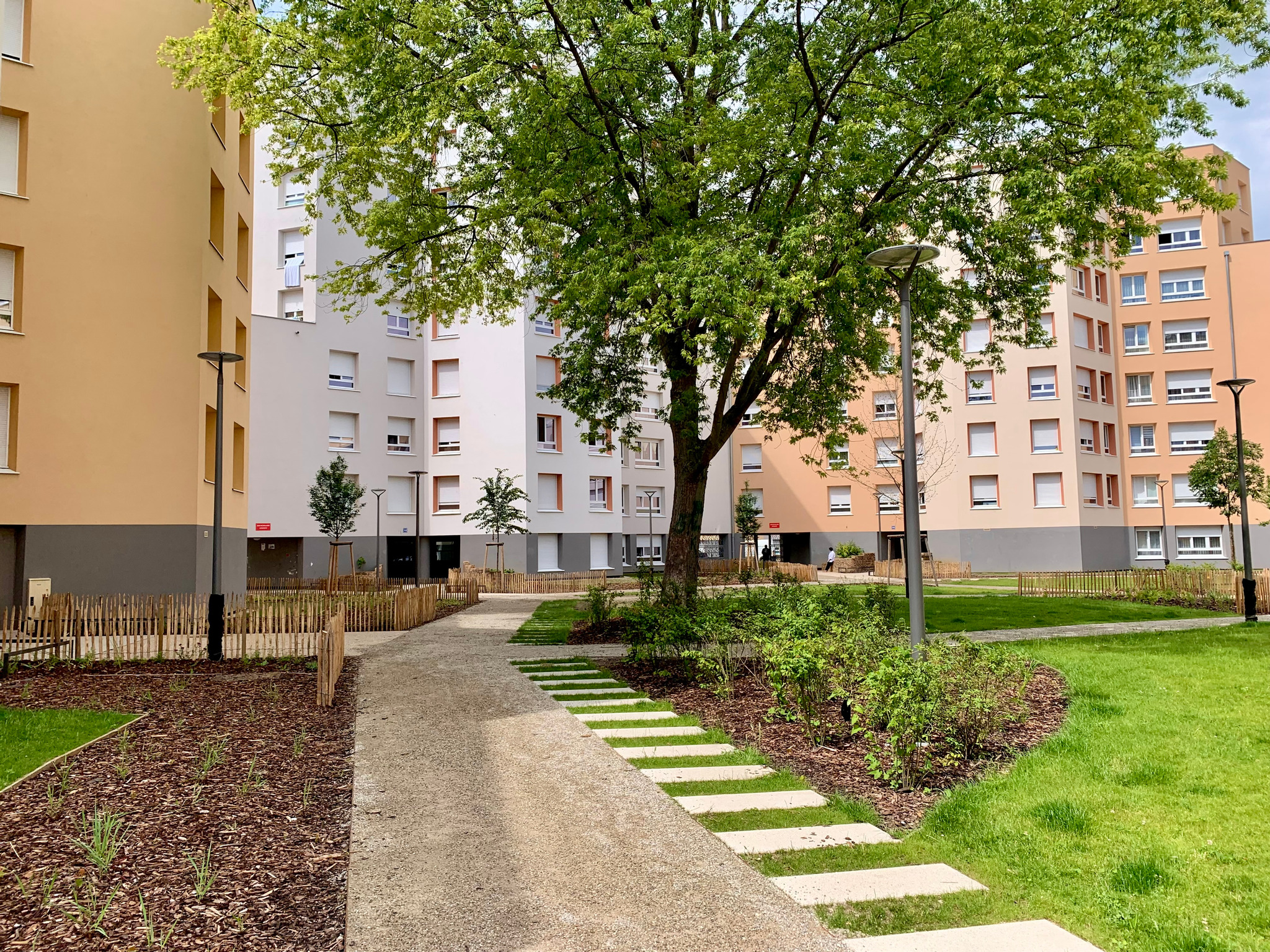 Enfin, la structure paysagère mise en place intègre les stationnements, les cheminements publics. Un grand alignement d’arbres sur la rue du Guirbaden apporte une identité urbaine pour l’entrée dans le quartier et adoucit le rapport aux bâtis.